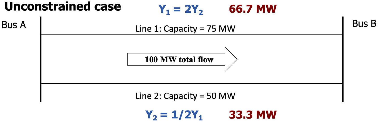 Since power flows across parallel paths in proportion to admittance, congestion on one path can limit overall flows across all parallel paths