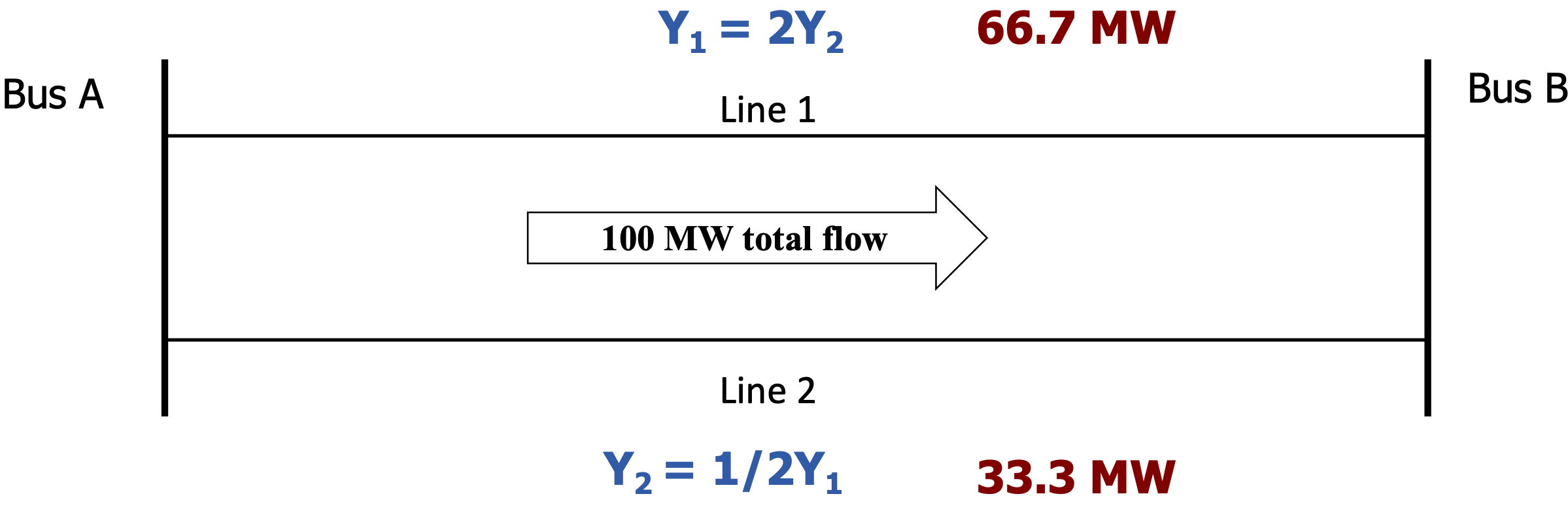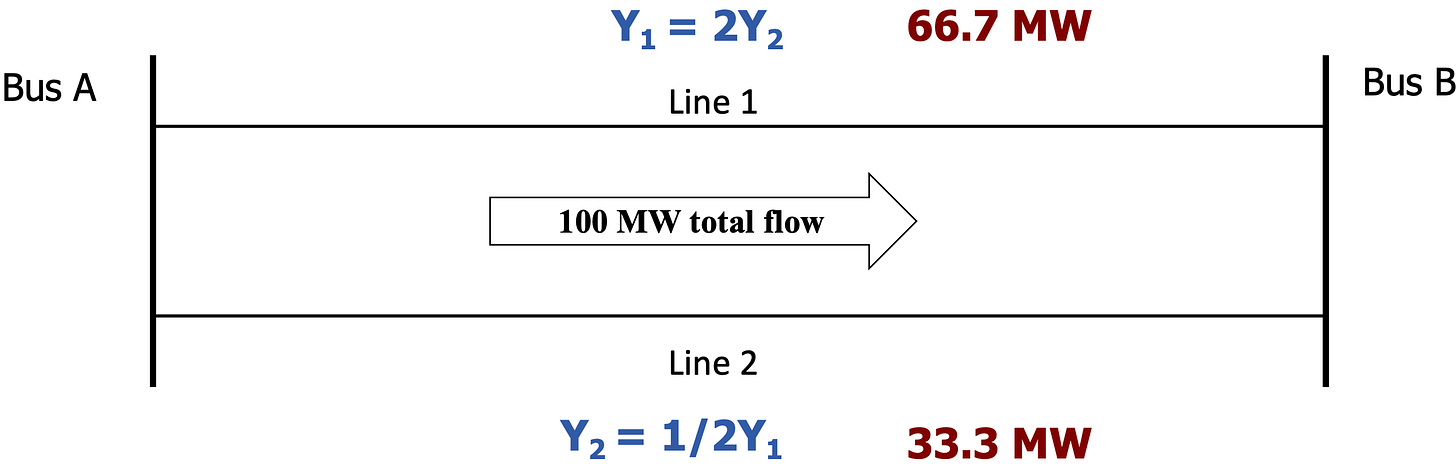Power flows across parallel circuits in proportion to their admittance (denoted Y), or in inverse proportion to impedance (Z)