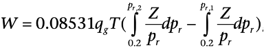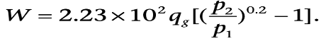 The theoretical work (W in hp) required to compress qg MMscf/d real gas at standard conditions (Tsc = 60°F, psc = 14.65 psia) is given as: