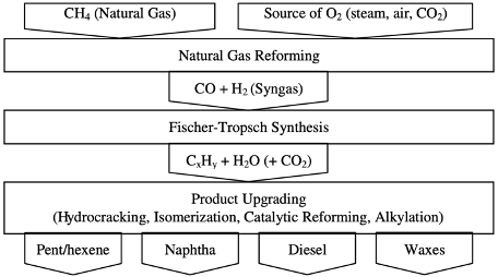 The indirect conversion of natural gas to liquid fuels goes through two main steps (reforming and Fischer-Tropsch) and may be followed by a third step (upgrading).