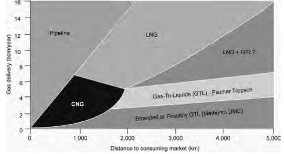 GTL facilitates the transportation of natural gas from remote production sources to consumption destinations if alternative methods, such as pipeline or LNG, are not economically or technically attractive. Since liquid fuels are easier to transport and distribute by ship, rail, or car, and to store at the destination, natural gas conversion to GTL offers superior flexibility in comparison to pipeline and LNG. GTL is not an alternative for places where CNG is attractive because the capital investment for GTL and the operating costs would not be suitable for the size of resources that would fit CNG applications.