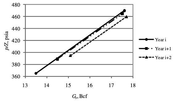 When there is gas loss, parallel lines appear from year to year and are shifted toward a larger gas volume at a given p/Z.