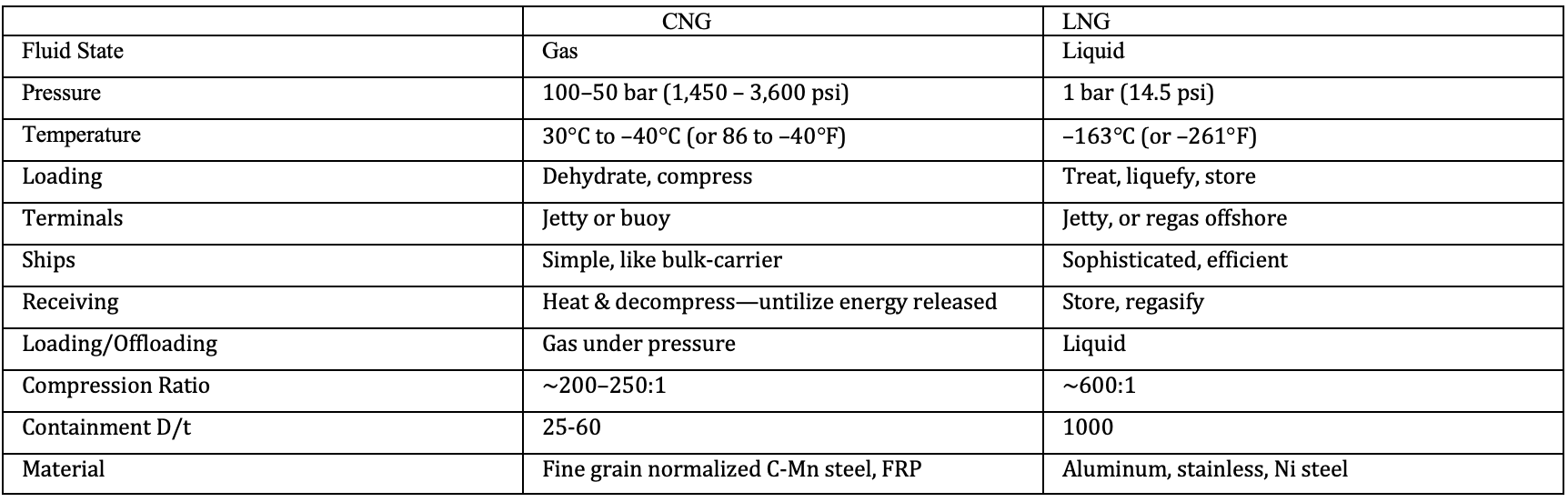 CNG is natural gas compressed at pressures of 2,000 to 3,000 psi (130 to 200 atm) and sometimes chilled (but not liquefied) to temperatures down to –40°F (–40°C) for even higher reduction of its volume. It is a technology proven in many applications, including transport by ship, truck, and barge. It has been used to fuel taxis, private vehicles, and buses worldwide. CNG transportation over sea requires specifically designed CNG ships, which are, in effect “floating pipelines”.